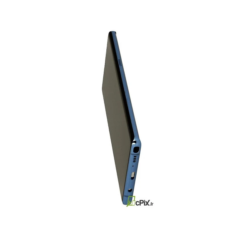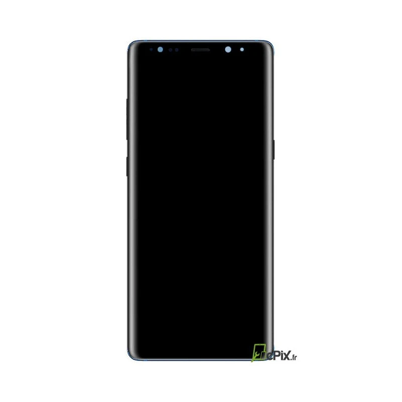 Face avant complète Galaxy Note 8 Bleu comprenant : Vitre tactile, écran 6.3’’ Super AMOLED Quad HD+, grille écouteur, haut parleur du haut (écouteur interne) pâte thermique, boutons volume, Bixby et power et leurs connectiques, l’ensemble est déjà assemblé sur le châssis métallique.